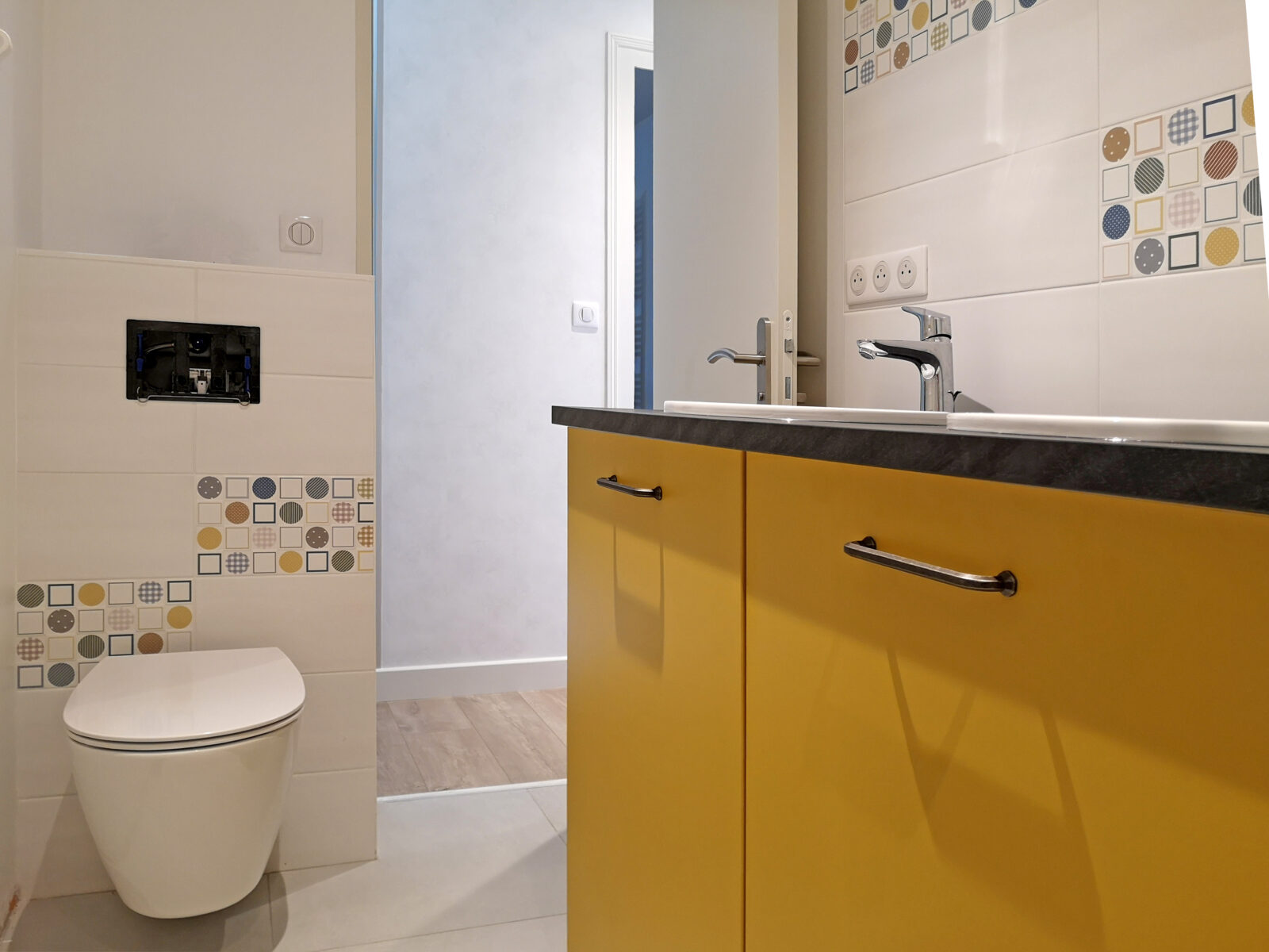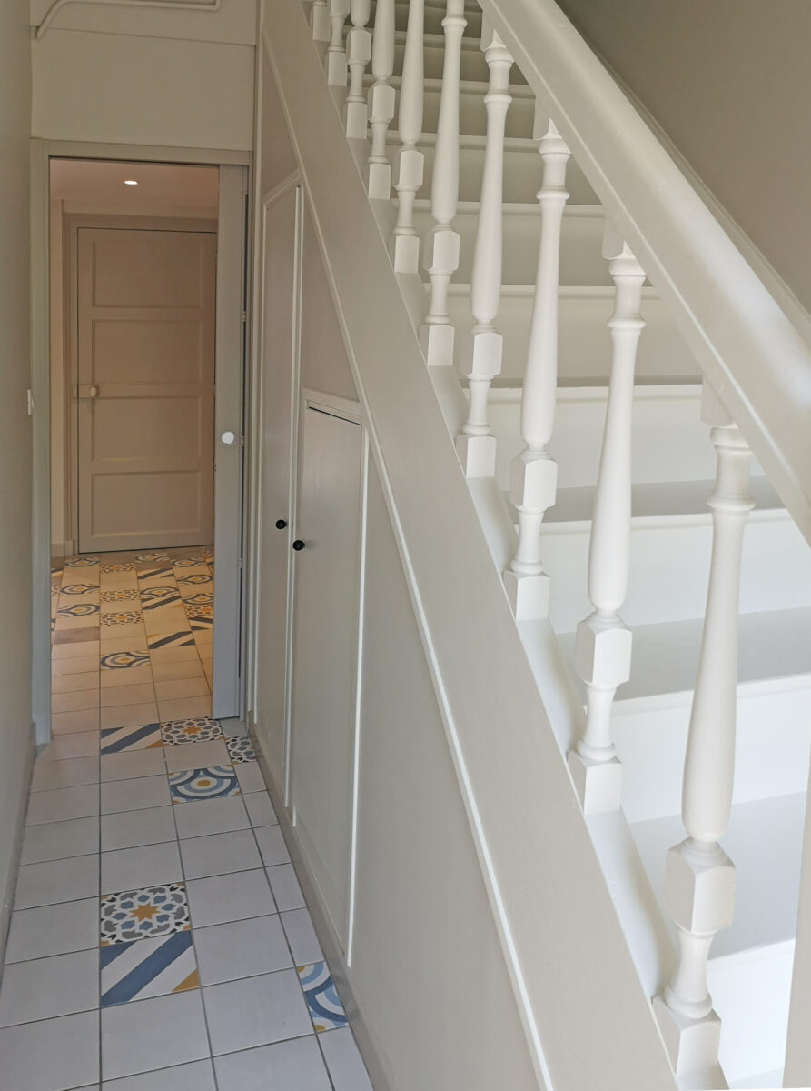 L’ambiance qui traverse l’ensemble du projet tient dans une formule juste et évidente : celle d’une maison de famille modernisée. Les coloris clairs et chaleureux instaurent une atmosphère lumineuse et accueillante, tandis que des motifs à effet carreaux de ciment viennent animer les surfaces avec caractère et subtilité. Entre héritage et contemporanéité, l’identité de la maison se réinvente sans se renier.