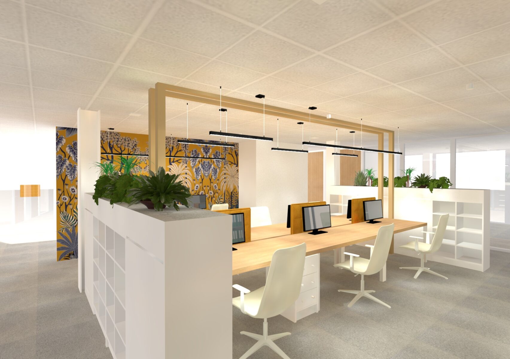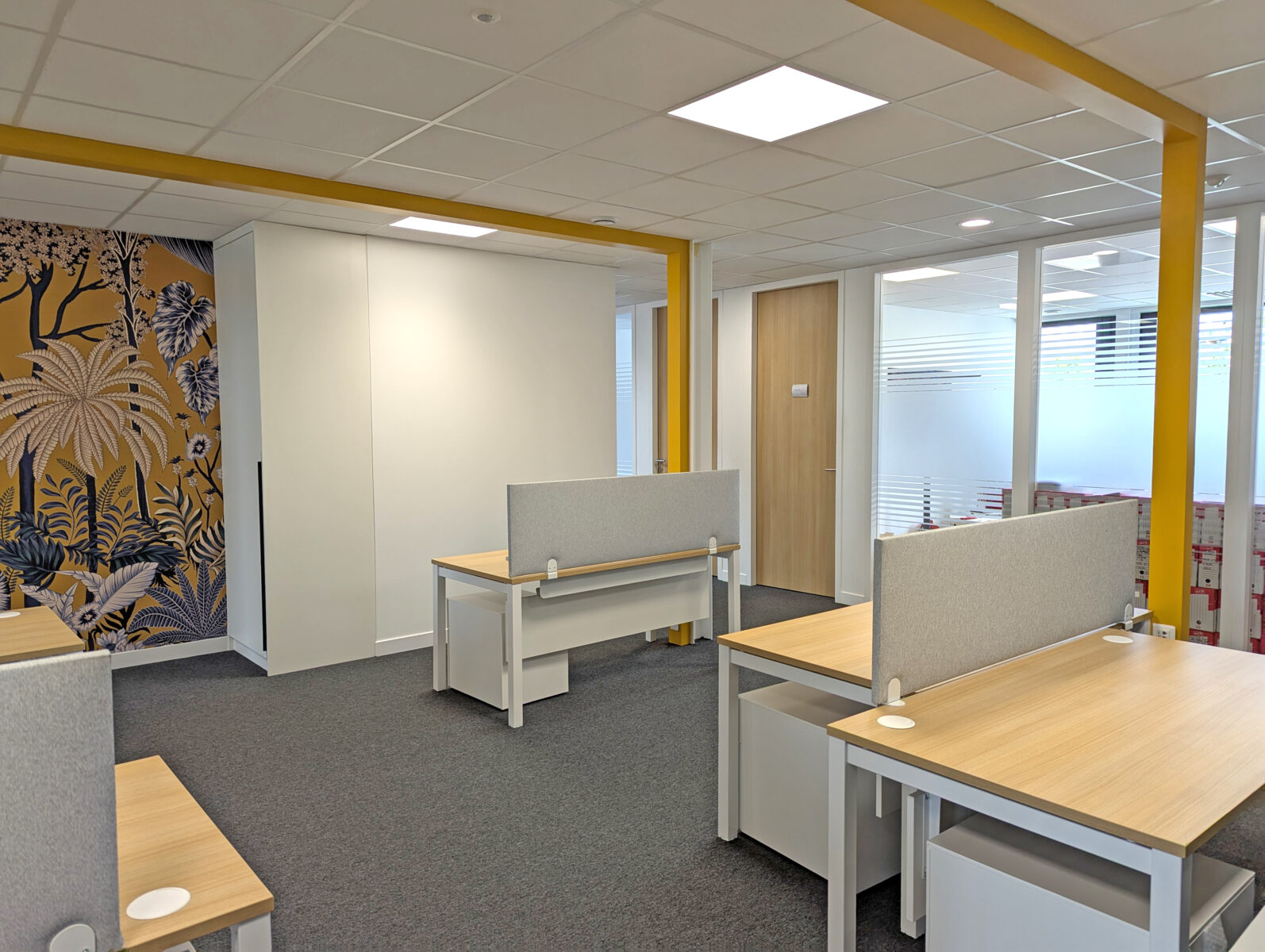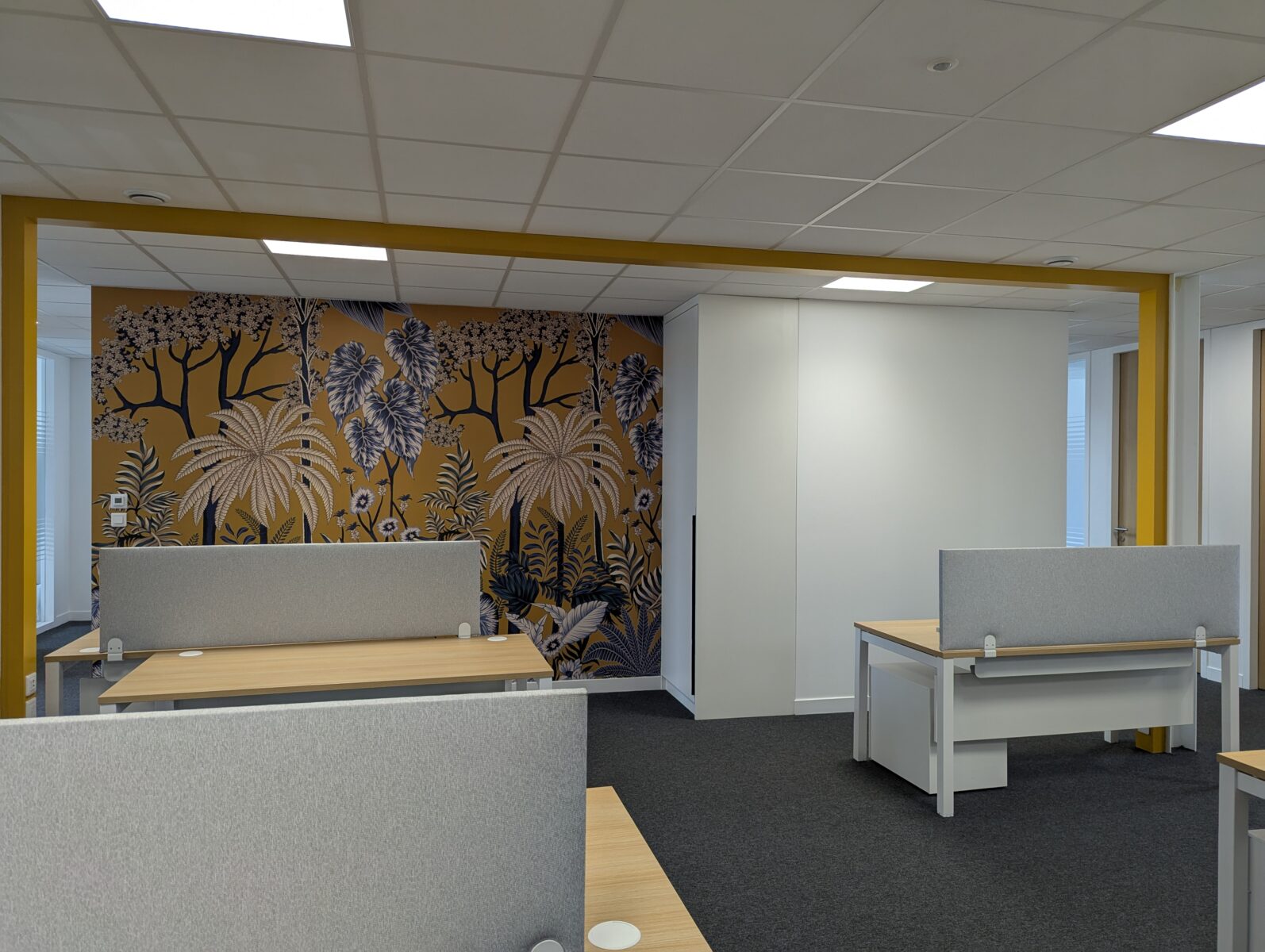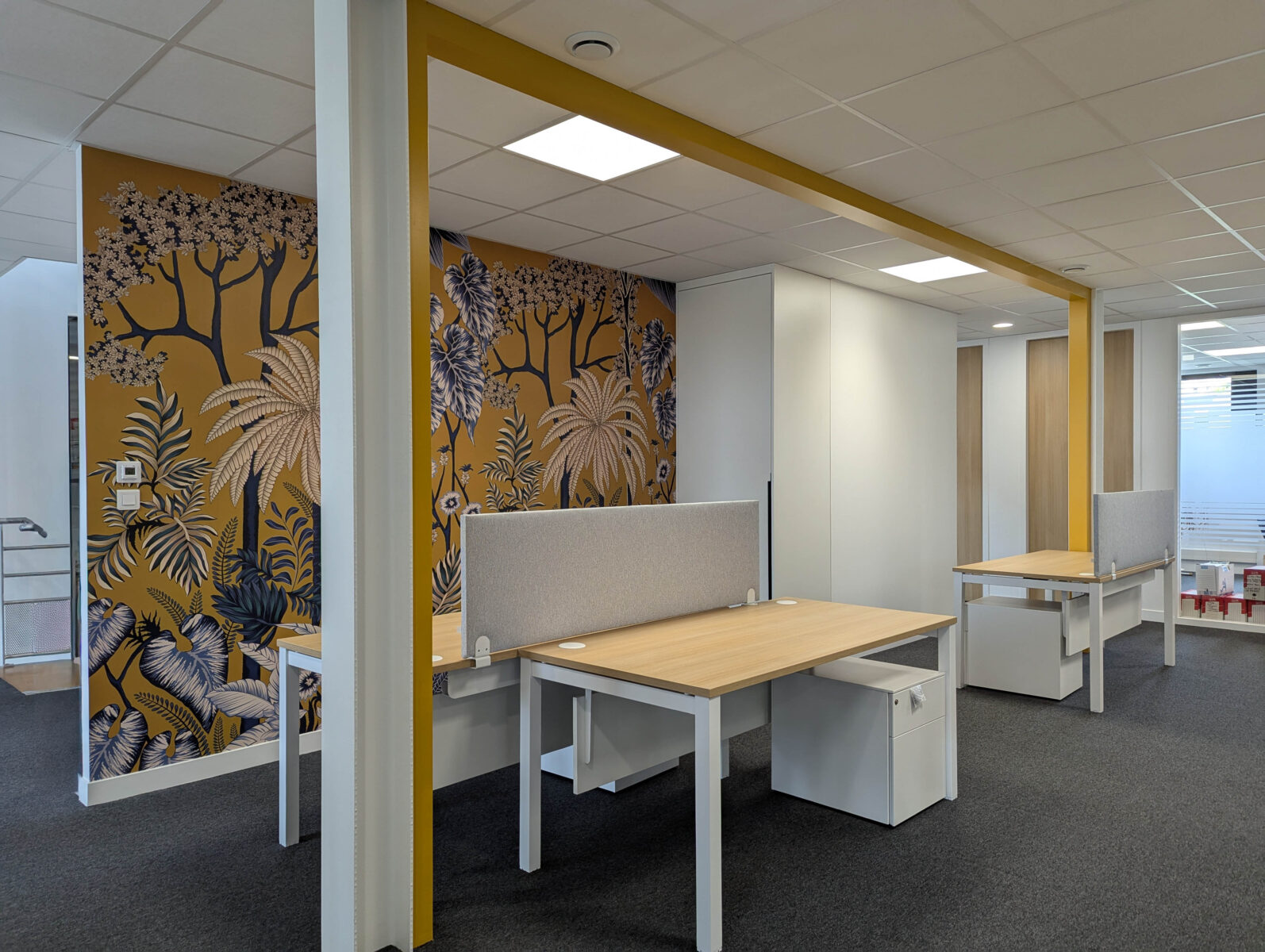 Le mobilier, sobre et blanc, s’efface au profit de l’espace, tandis que des panneaux acoustiques fixés aux plateaux des bureaux assurent un double rôle : traitement sonore et séparation visuelle entre les postes. Chaque poste bénéficie par ailleurs de son propre élément de rangement, pour un ensemble simple, fonctionnel et néanmoins singulier. Enfin, un papier peint de caractère, résolument coloré, habille le mur restant et rompt avec l’austérité que l’on prête trop souvent aux espaces de travail — une touche d’inattendu qui dynamise l’ensemble et donne envie de s’y installer.