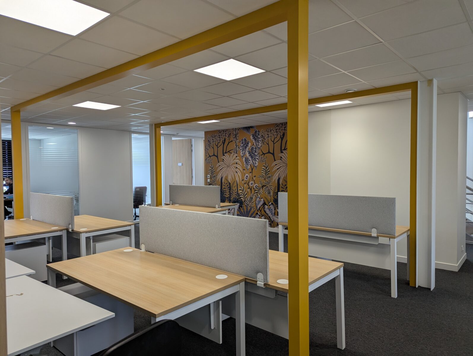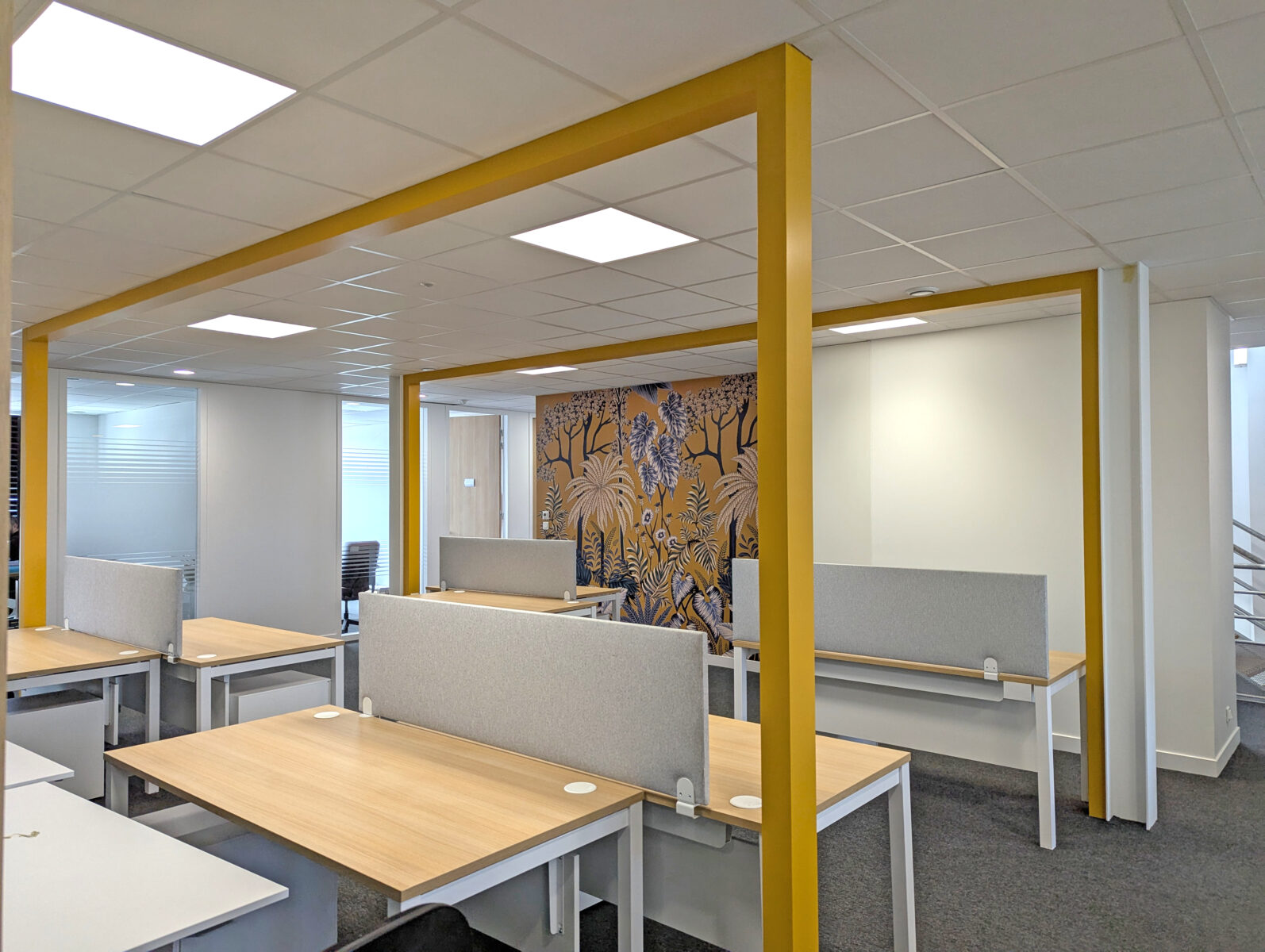 C’est souvent dans la contrainte que naissent les solutions les plus inventives. Ici, la nécessité de redescendre les alimentations électriques depuis le plafond jusqu’aux postes de travail aurait pu se résoudre par une simple goulotte technique — fonctionnelle, mais sans intérêt. Le parti pris architectural a été tout autre : des structures en portique ont été conçues pour assumer pleinement ce rôle, transformant une contrainte technique en élément graphique fort. Ces portiques définissent visuellement l’espace, lui confèrent une identité affirmée et structurent l’open-space avec une cohérence que seule une approche globale en architecture intérieure permet d’atteindre.