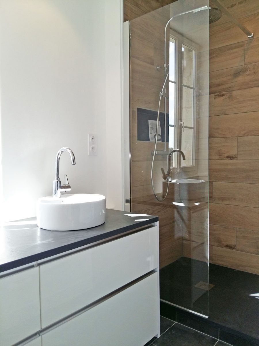 Au premier étage, entièrement dédié aux parents, une salle d’eau a été créée de toutes pièces et conçue en séquence avec un dressing — pièce tampon entre l’espace eau et la chambre, pensée pour préserver le sommeil de celui qui reste au lit. La chambre s’articule autour d’un mur vert émeraude qui structure l’espace et reçoit la tête de lit, instaurant une présence colorée forte et enveloppante. La salle d’eau déploie un long meuble vasque généreux en rangements, tandis qu’une douche ample s’insère en bout de pièce. La palette retenue — tons bois, anthracite et blanc — crée une atmosphère volontairement dépouillée, sans jamais verser dans la froideur.