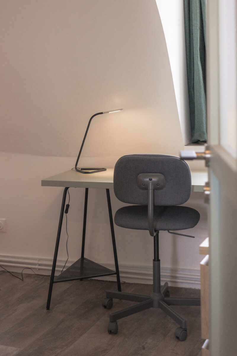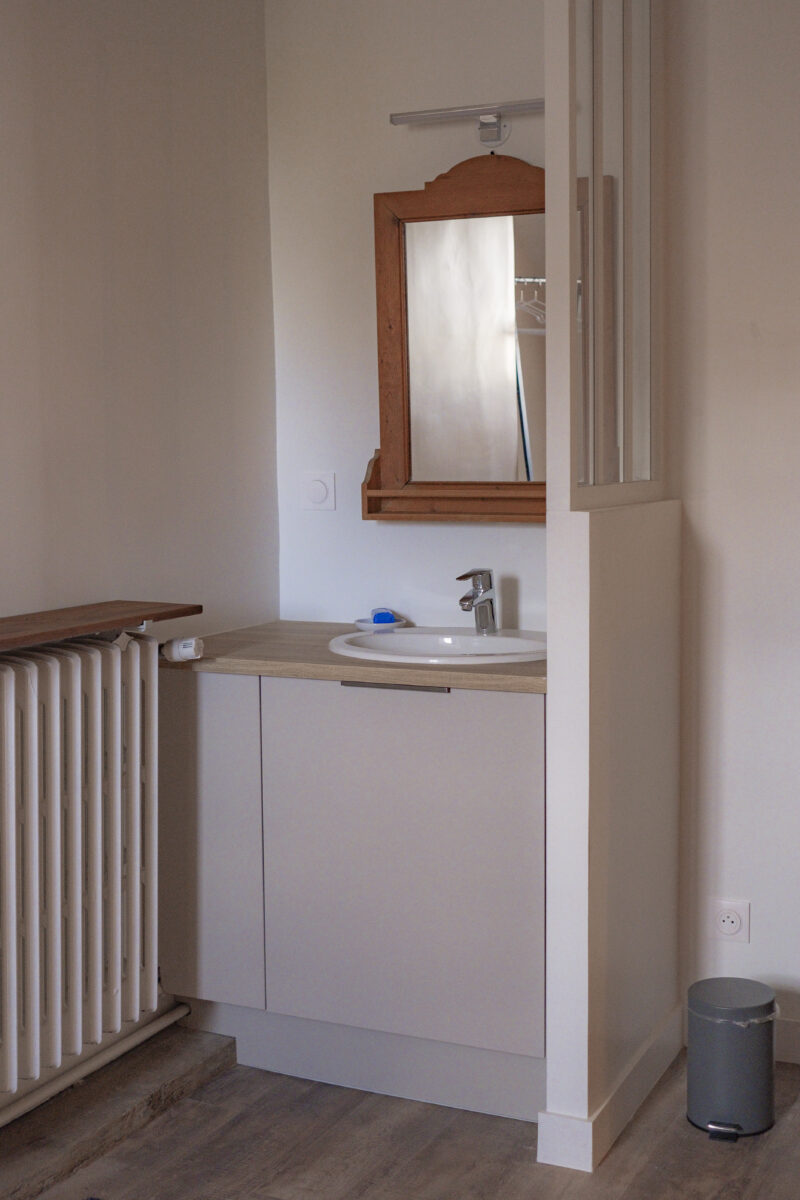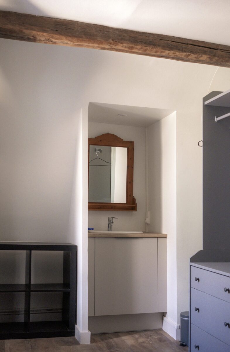 Dans les chambres, un point d’eau individuel a été intégré à chaque espace privatif, réduisant les croisements matinaux et fluidifiant la vie commune au quotidien. La salle d’eau, entièrement repensée et réorganisée, tourne résolument la page de la baignoire encombrante pour s’ouvrir sur une douche généreuse — conçue avec soin pour composer avec la contrainte du rampant et en tirer le meilleur parti.
