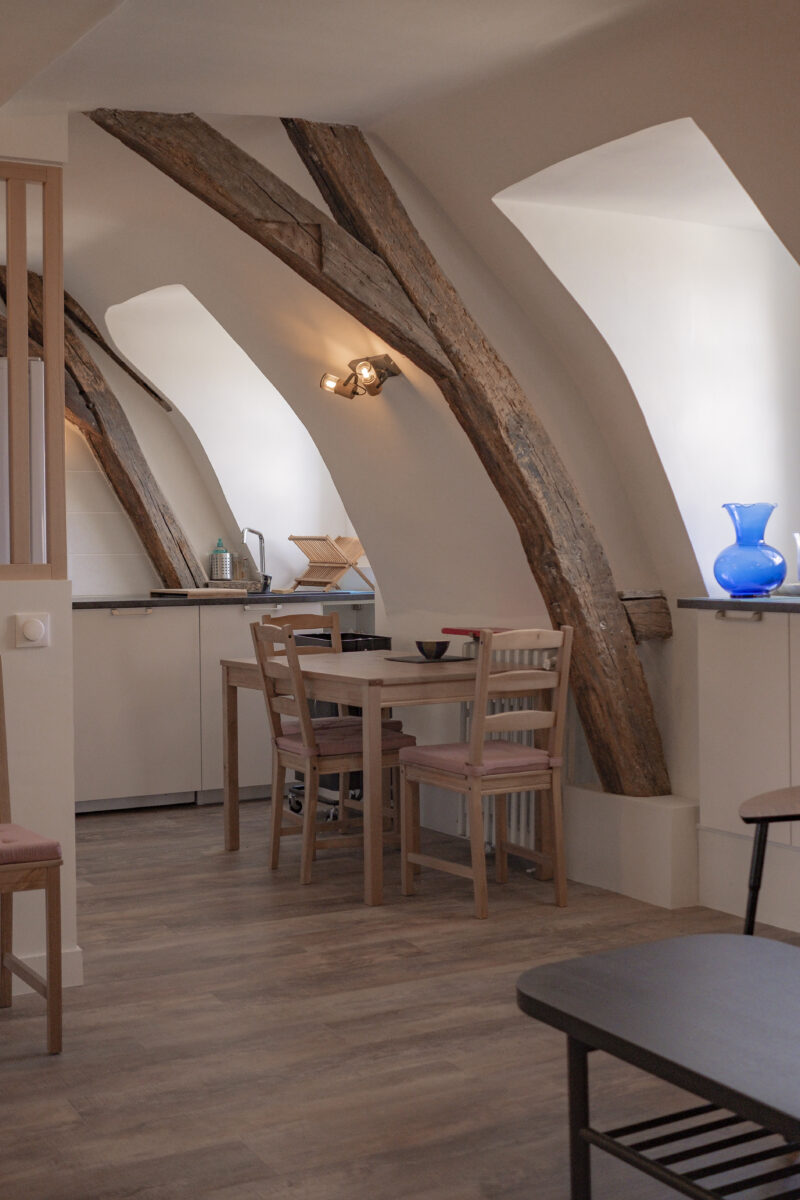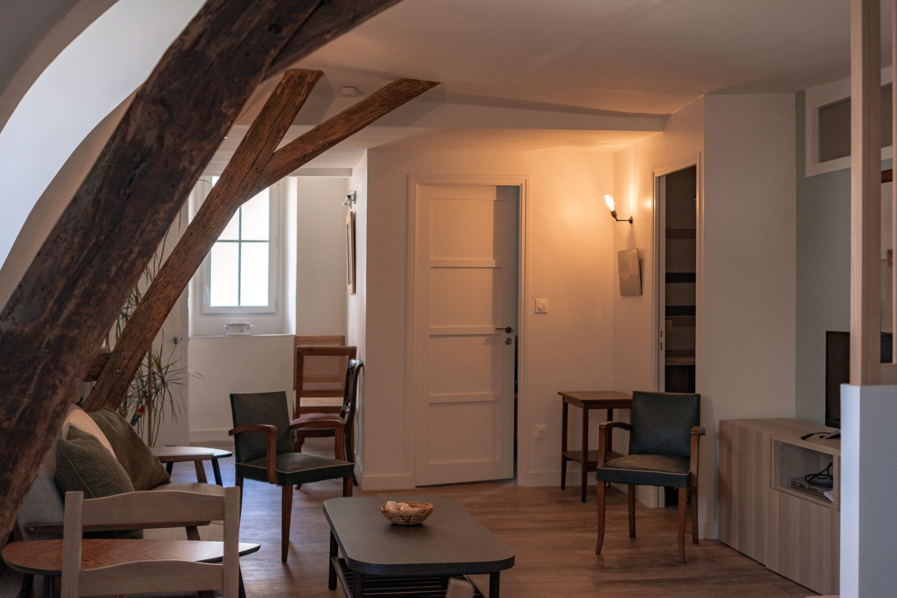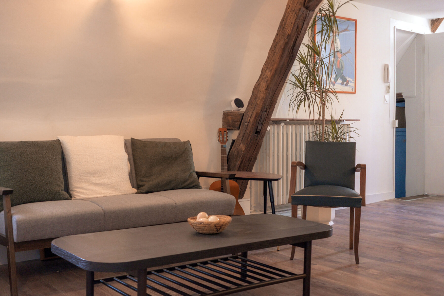 Cette nouvelle disposition révèle ce que l’appartement avait de plus précieux : les poutres apparentes reprennent leur rôle de protagonistes, le cachet de l’ancien reprend ses droits, et le séjour trouve enfin sa juste identité — celle d’un espace de vie chaleureux et singulier, à la hauteur du bâtiment qui l’abrite.
